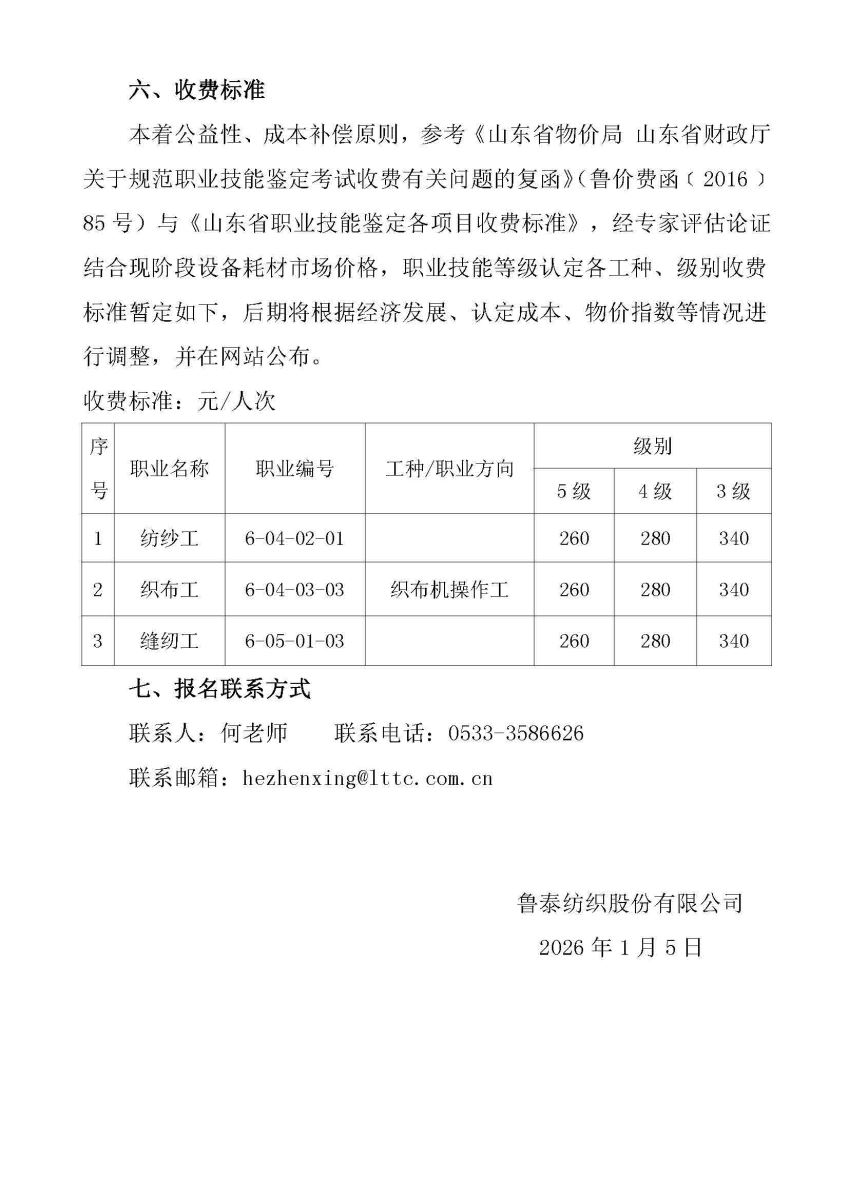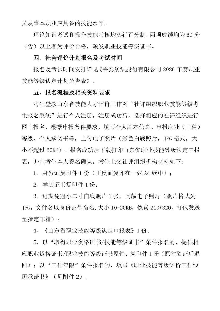 鲁泰纺织股份有限公司社会评价组织职业技能等级认定公告